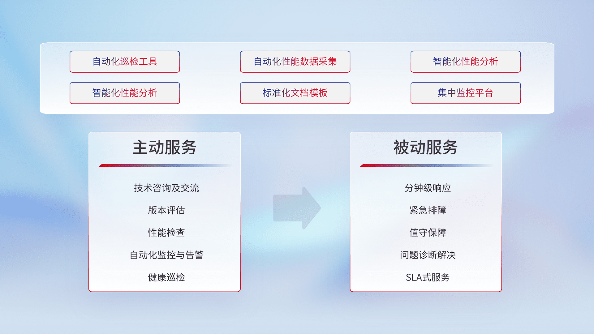 智能化工具和标准化文档,,,保障服务质量,,提供主动服务(包含技术咨询、、版本评估、、、性能检查、、、自动化监控与告警、、、、健康巡检)和被动服务包含(分钟级响应、、、、紧急排障、、、、值守保障、、问题诊断解决、、、、SLA服务)。。。。